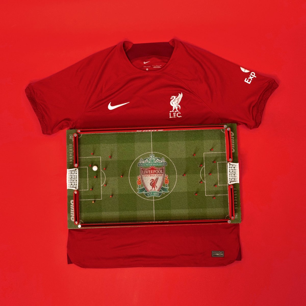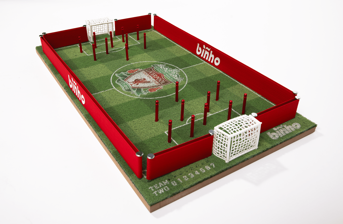 Bring the legendary Anfield with you anywhere! This board features custom stadium-striped Green Turf pitch with the iconic Liverpool logo at center field. The Binho Bands are red, the player pieces are red and the goals are white. This board will also ship in the Liverpool Binho Carrying Case!